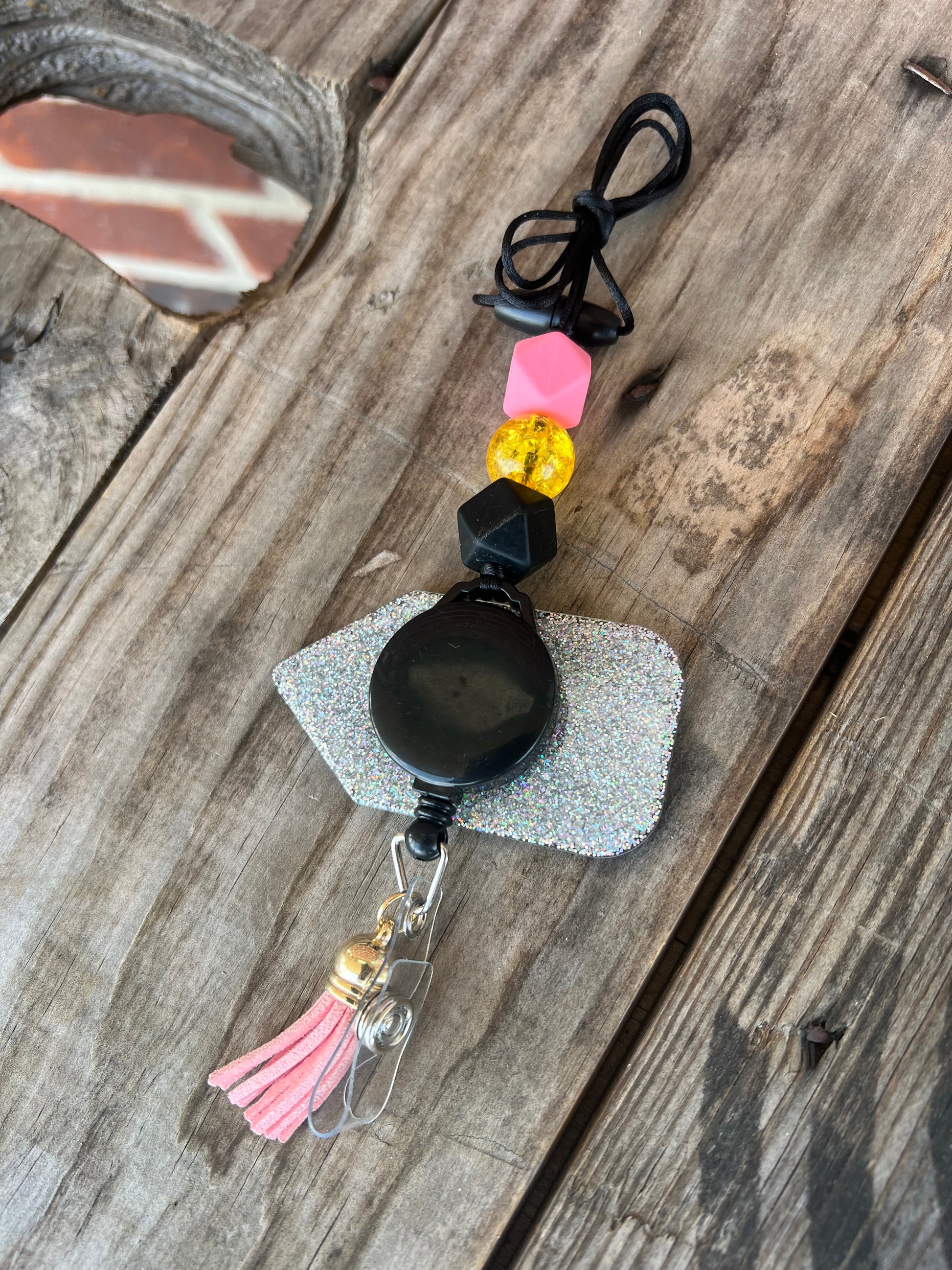 Acrylic Pencil on retractable badge holder with pink tassel. 3 beads on cording with plastic snap clasp.